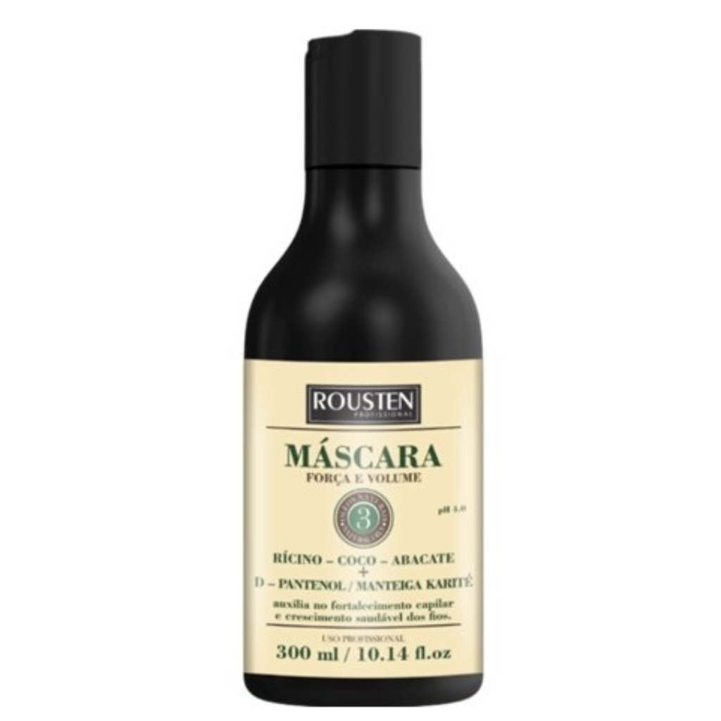 Modo de Uso: Após o uso do SHAMPOO FORÇA E VOLUME ROUSTEN, retire o excesso de água e aplique a MÁSCARA FORÇA E VOLUME ROUSTEN. Massageie suavemente com a ponta dos dedos da raiz as pontas com movimentos circulares para estimular a microcirculação. Aguarde 5 a 8 minutos. Enxágue bem. Uso Diário.